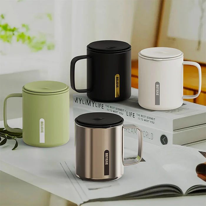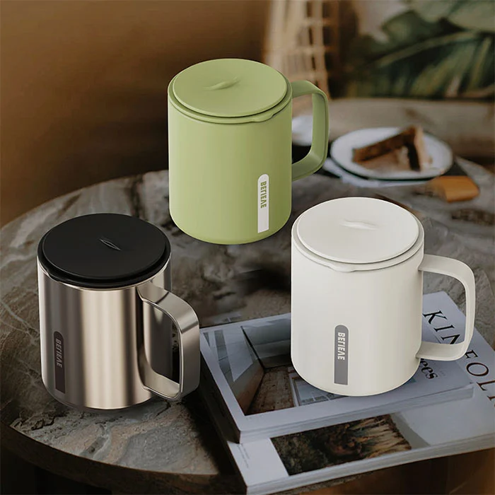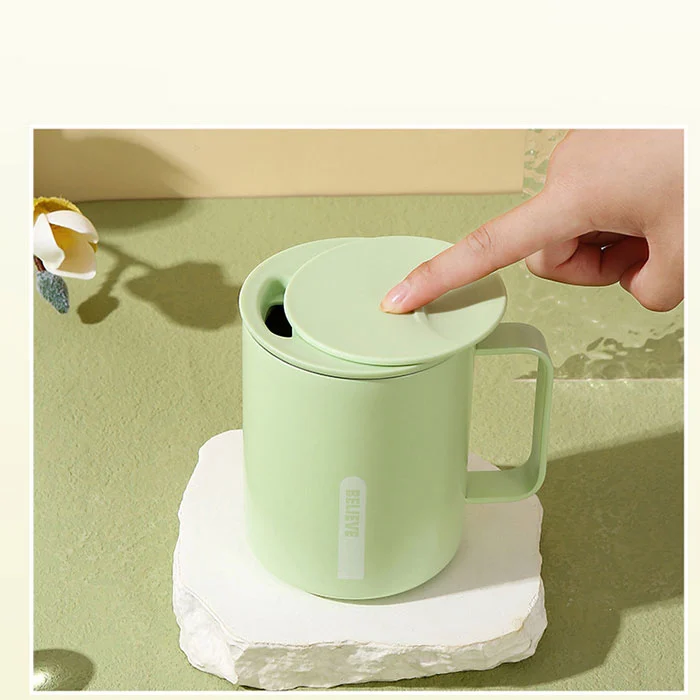 Bulegoan denbora luzez eserita ura edaten duzun bitartean, estalkiaren klik bakarreko irekierak ez du lana traba egiten, isolamendua eta hoztea eskaintzen du, kafea eta tea hartzeko egokia;