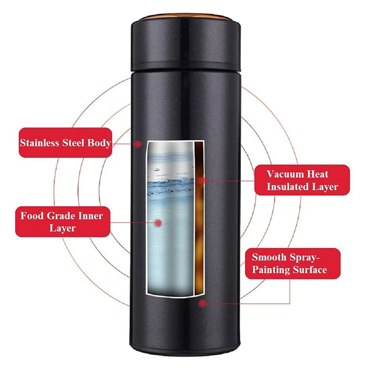 - Harresi bikoitzeko hutsezko isolamendu teknologiak zure edari gogokoenak (kafea, zopa, esnea, zukuak, etab.) Hurrengo orduetan nahi den tenperatura mantenduko duela ziurtatzen du. Edari beroek 24 ordu iraun dezakete eta edari hotzak 12 ordu iraun ditzake. Tapa altzairu herdoilgaitzezko barneko nukleo eta segurtasuneko elikagaien silikonazko zigilua da. Hari isometrikoaren diseinuaren kopa-ahoarekin erabiltzen da isolamendu anitz eta 360 º-ko iragazgaitza emateko isolamendu iraunkorragoa lortzeko.