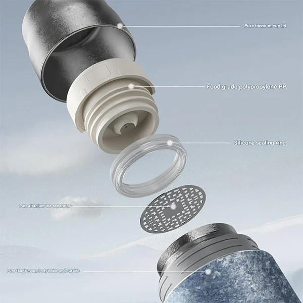 Titaniozko botila honek isuririk gabeko kopa dauka %99,9 titanio puruz egina! Ez estaldura kimikorik! Titanioa, biobateragarritasun ona eta korrosioarekiko erresistentzia ona duena, material arrunten gainetik dago, hala nola aluminioa, plastikoa, beira eta altzairu herdoilgaitza. Ez da toxikoa, segurua eta osasuntsua, eta ez die inolako zaporerik edo usainik emango janariei edo edariei. Bere izaera berrerabilgarria urte askotan lagun zaitzake.